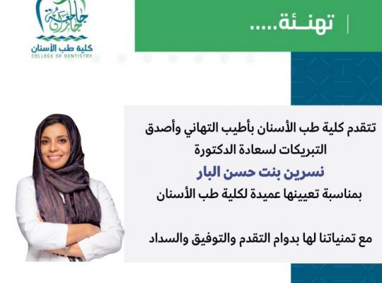 صدر يوم الأحد الموافق ٥ / ٢ / ٢٠٢٢ م قرار رئيس جامعة جازان د. مرعي بن حسين القحطاني بتعيين د.نسرين بنت حسن محمد البار عميداً لكلية طب الأسنان خلفاً للدكتور هيثم بن ناصر فقيه .. وتعد د.نسرين من الكفاءات التي تعمل تحت مظلة جامعة جازان وتدرجت في عدة