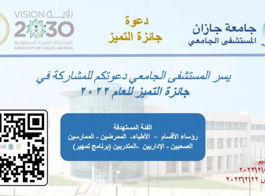 يسر المستشفى الجامعي الإعلان عن بدء التقديم لجائزة التميز للعام ٢٠٢٢ حيث تهدف مبادرة جائزة التميز لتحفيز الأفراد والأقسام وتشجيع الممارسات اإلبداعية نحو التميز، والتفوق العملي، وتكريم المبدعين والمتميزين في جميع المجاالت، ونشر ثقافة الجودة والتنافسية