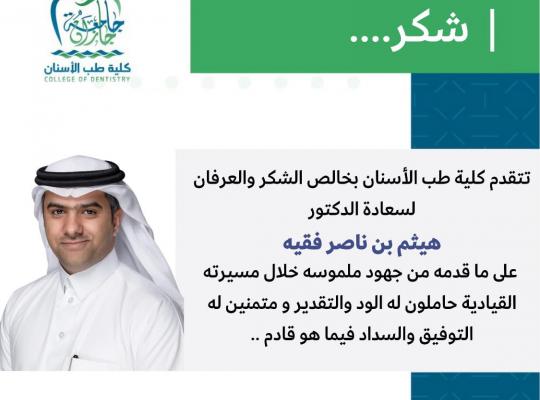 تقديراً وأمتناناً لجهود سعادة عميد الكلية السابق الدكتور / هيثم بن ناصر فقيه ، تتقدم كلية طب الأسنان بخالص الشكر والعرفان ممثلة بعميدتها الدكتورة / نسرين بنت حسن البار ، وإدارة الكلية وكافة المنسوبين لكل ما قدمه في خدمة الكلية ومساهمته في تطويرها