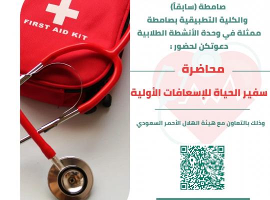 جامعة جازان: إدارة الإعلام أقامت الكلية التطبيقية بصامطة بالتعاون مع هيئة الهلال الأحمر السعودي محاضرة بعنوان سفير الحياة للإسعافات الأولية بحضور طالبات الكلية وعدد من أعضاء هيئة التدريس. وتهدف مثل هذه المحاضرات والدورات للتعريف بأهمية الإسعافات