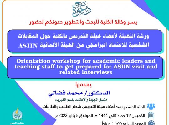 قدمت وكالة #كلية_العلوم للبحث والتطوير ورشة عمل بعنوان "التهيئة لأعضاء هيئة التدريس بالكلية حول المقابلات الشخصية للاعتماد البرامجي من الهيئة الألمانية ASIIN " قدمها الدكتور / محمد فضالي منسق الجودة والاعتماد بقسم الفيزياء وذلك بحضور العديد من أعضاء