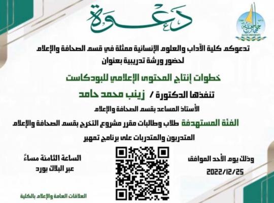 جامعة جازان: إدارة الإعلام تحت عنوان " خطوات إنتاج المحتوي الإعلامي للبودكاست " أقامت كلية الآداب والعلوم الإنسانية شطر الطالبات أولى دوراتها الموجهة لطلاب مشاريع التخرج، والبرنامج التدريبي (تمهير) برعاية قسم الصحافة والإعلام بالكلية، قدمتها د. زينب