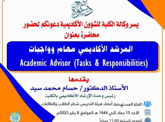 قدمت وكالة #كلية_العلوم للشؤون الأكاديمية محاضرة بعنوان "المرشد الأكاديمي (مهام وواجبات)" قدمها الأستاذ الدكتور حسام سيد، رئيس وحدة الارشاد الأكاديمي بالكلية وذلك تحت إشراف الدكتور عبدالله مشرقي وكيل الكلية للشؤون الأكاديمية وبحضور العديد من أعضاء