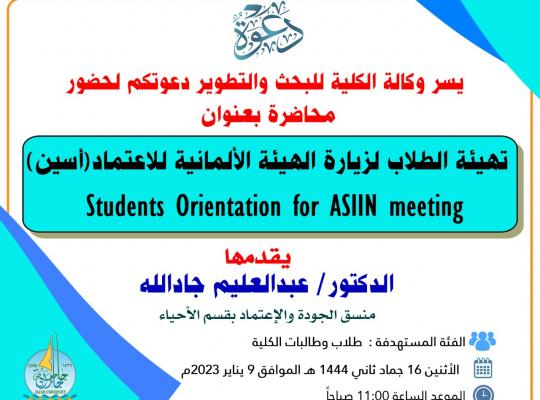 قدمت وكالة #كلية_العلوم للبحث والتطوير محاضرة بعنوان " تهيئة الطلاب لزيارة الهيئة الألمانية للاعتماد (ASIIN). قدمها الدكتور عبدالعليم جادالله، منسق الجودة والاعتماد بقسم الأحياء وذلك بحضور طلاب وطالبات الكلية.