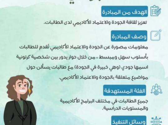 جامعة جازان: إدارة الإعلام أطلقت وكالة البحث والتطوير بالكلية التطبيقية بصامطة ممثلة في وحدة الجودة مبادرة (اسألي جودي) والتي تهدف إلى تعزيز ثقافة الجودة والاعتماد الأكاديمي لدى الطالبات وتستهدف جميع الطالبات في جميع البرامج الأكاديمية والمستويات