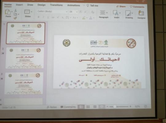 بحضور سعادة وكيلة الجامعة لشؤون الطالبات د. فاطمة بنت عبد العزيز عقيلي، وبرعاية كريمة من سعادة عميدة الكلية الجامعية بالدرب د. اميمه بنت عبد الوهاب رضوان، أقامت الكلية وبالشراكة مع مديرية مكافحة المخدرات بمحافظة الدرب برنامج توعوي بأضرار المخدرات تحت