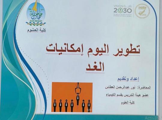 برعاية وكيلة كلية العلوم د. آمنه شماخي نفذت وحدة النشاط الطلابي بالتعاون مع قسم الكيمياء دورة تدريبية بعنوان "تطوير اليوم إمكانيات الغد" قدمتها أ. نور عبدالرحمن العطاس، تضمنت الدورة أهم المهارات التي يحتاجها الطالب لتطوير مهاراته و التي تساعده في