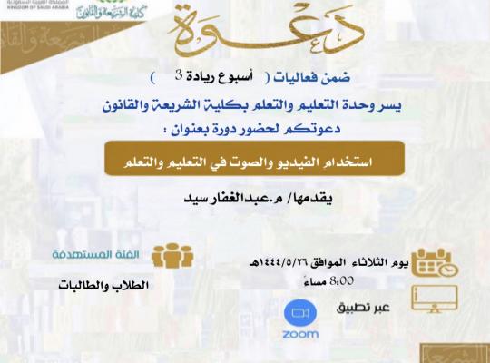 ضمن الدورات التدريبية في أسبوع ريادة ٣، نظمت وكالة كلية الشريعة والقانون للتطوير، ممثلة في وحدة التعليم والتعلم، يوم الثلاثاء ٢٦/ ٥/ ١٤٤٤؛ الساعة الثامنة مساء، عبر منصة زوم، دورة تدريبية عن استخدام الفيديو والصوت في التعليم والتعلم، بالتعاون مع عمادة