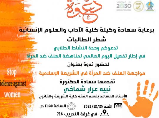جامعة جازان: إدارة الإعلام قدمت وحدة النشاط الطلابي بكلية الآداب والعلوم الإنسانية شطر الطالبات ندوة بعنوان" مواجهة العنف ضد المرأة في الشريعة الإسلامية" ألقتها الدكتورة نبيه شماخي الأستاذ المساعد بقسم الفقه كلية الشريعة والقانون، و ذلك في إطار تفعيل