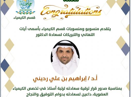 يتقدم منسوبو ومنسوبات قسم الكيمياء بأسمى آيات التهاني والتبريكات لسعادة الدكتور إبراهيم بن علي رديني بمناسبة صدور قرار ترقية سعادته لرتبة أستاذ في تخصص الكيمياء العضوية، سألين الله له دوام التوفيق والنجاح.