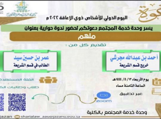 جامعة جازان: إدارة الإعلام شاركت كلية الشريعة والقانون في تفعيل اليوم الدولي للأشخاص ذوي الإعاقة بندوة حوارية بعنوان ملهم عبر منصة زووم قدمها طالبا كلية الشريعة ضيفان من ذوي الإعاقة، وهما: أ. أحمد بن عبدالله مجرشي خريج قسم الشريعة، وعمر بن حسين سيد
