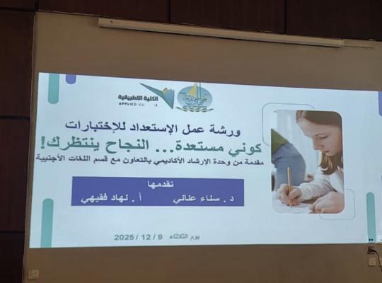 نظم فرع الكلية التطبيقية بصامطة بالتعاون مع وحدة الإرشاد الأكاديمي وقسم اللغات الأجنبية ورشة عمل بعنوان " كوني مستعدة ...النجاح ينتظرك" تزامناً مع فترة الاختبارات النهائية للفصل الدراسي الأول للعام الجامعي 1447هـ الورشة من تقديم كلاً من الدكتورة سناء
