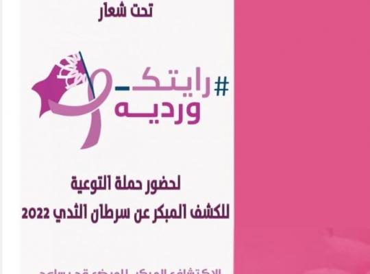 حملة التوعية للكشف المبكر عن سرطان الثدي 2022 نظم قسم الاشعة التشخيصية بكلية العلوم الطبية التطبيقية بالتعاون مع كلية الطب تزامناً مع الحملة الوطنية للكشف المبكر عن سرطان الثدي ( تحت شعار ((رايتك وردية )) بإشراف ومتابعة عميد الكلية د. ايمن مدخلي