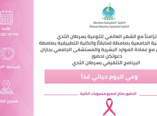 جامعة جازان: إدارة الإعلام تزامناً مع الشهر العالمي بسرطان الثدي، نظمت الكلية التطبيقية بصامطة بالتعاون مع المستشفى الجامعي وعمادة الموارد البشرية برنامجاً تثقيفيا للتوعية بسرطان الثدي تحت شعار "وعي اليوم حياتي غداً". حيث أشتمل البرنامج على أركاناً