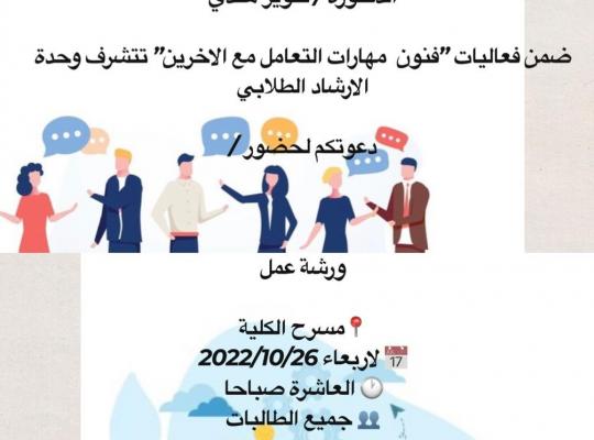 تحت رعاية سعادة عميدة الكلية الجامعية بالداير الدكتورة تنوير أحمد هندي قدمت وكالة الشؤون الأكاديمية ممثلة في وحدة الإرشاد الطلابي ورشة عمل بعنوان (فنون مهارات التعامل مع الآخرين) وذلك في يوم الأربعاء 26\10\2022 بمسرح الكلية قدمتها الدكتور/ فاطمة