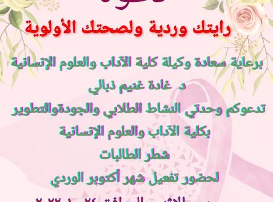 جامعة جازان: إدارة الإعلام اكتست كلية الآداب والعلوم الإنسانية شطر الطالبات باللون الوردي تفعيلًا للاحتفاء بشهر أكتوبر الوردي، برعاية وكيلة الكلية الدكتورة غادة غنيم ذبالي حيث شاركت وحدتا النشاط الطلابي والجودة والتطوير ممثلة في مبادرتها " بصمة تطوير