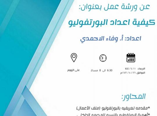 نفذت وحدة النشاط الطلابي بكلية التصميم والعمارة ورشة بعنوان ( كيفية اعداد البورتفوليو ) تقديم ا. وفاء الأحمدي للطالبات المقبلات على التخرج اشتملت على عدة محاور اهمها مقدمه تعريفيه بالبورتفوليو (ملف الأعمال) و أهميته بالنسبه للمصمم الداخلي وبالنسبه
