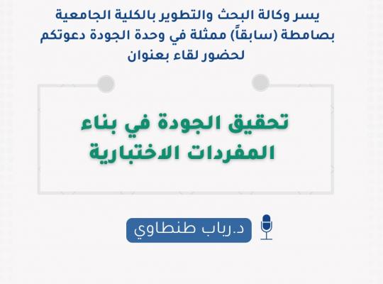 جامعة جازان: إدارة الإعلام نفذت وكالة البحث والتطوير بالكلية التطبيقية بصامطة ممثلة في وحدة الجودة ورشة عمل بعنوان تحقيق الجودة في بناء المفردات الاختبارية استهدفت أعضاء هيئة التدريس وقامت بتنفيذها د. رباب طنطاوي تناولت محاور رئيسية شملت تعريف ماهية
