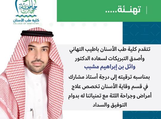 تتقدم كلية طب الأسنان وكافة منسوبيها بأسمى آيات التهاني والتبريكات للدكتور/ وائل إبراهيم مشبب على ترقيته إلى رتبة أستاذ مشارك راجين له دوام التوفيق، وبذل قصارى الجهد في أداء الأمانة، وخدمةً للوطن ومجتمعه، وتحقيقاً لتطلعات قيادتنا الرشيدة.