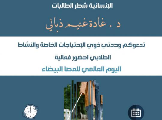 جامعة جازان: إدارة الإعلام فعّلت كلية الآداب والعلوم الإنسانية (شطر الطالبات) اليوم العالمي للعصا البيضاء، وذلك برعاية وكيلة الكلية د. غادة غنيم ذبالي بالتعاون بين وحدة ذوي الاحتياجات الخاصة ووحدة النشاط الطلابي وذلك على مسرح المجمع الأكاديمي1 بحضور