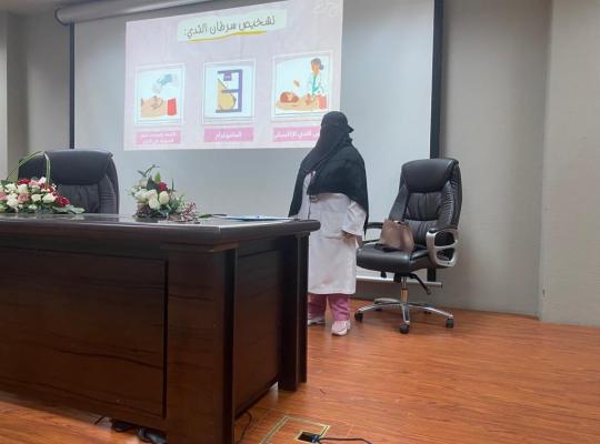 محاضرة توعوية بسرطان الثدي في الكلية الجامعية بفرسان استقبلت الكلية الجامعية بفرسان الطبيب العام خديجة عبد الله عقيلي قدمت محاضرة توعوية بسرطان الثدي مزامنة لشهر التوعوية بسرطان الثدي واشتملت المحاضرة على عدة نقاط أبرزها: التعريف بسرطان الثدي
