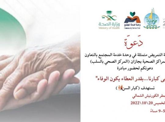 تسر وكالة كلية التمريض متمثلة في وحدة خدمة المجتمع بالتعاون مع إدارة المراكز الصحية بجازان (المركز الصحي بالسلب) دعوتكم لحضور مبادرة (( نرعى كبارنا ....بقدر العطاء يكون الوفاء)) تستهدف (كبار السن) وذلك بالكورنيش الشمالي يوم الخميس الموافق 2022/10/20