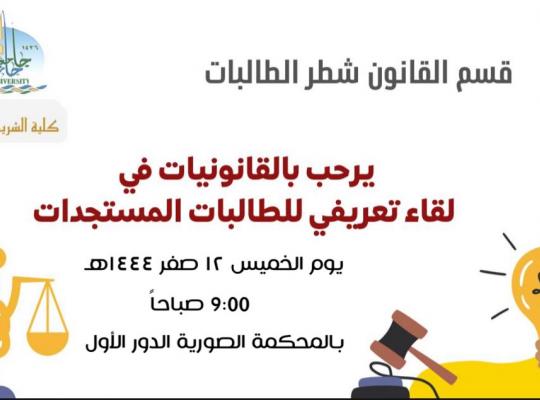 أقام قسم القانون شطر الطالبات يوم الخميس ١٢ صفر 1444هـ لقاءً تعريفياً للطالبات المستجدات ؛ حيث حرص أعضاء القسم فيه على تحقيق الاستفادة القصوى من اللقاء من خلال مجموعة من المواضيع الهامة والمُلهمة والمرتبطة بالحياة الجامعية والأكاديمية والدراسية
