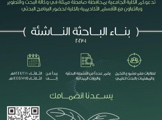 جامعة جازان: إدارة الإعلام أطلقت وكالة البحث والتطوير بالكلية التطبيقية بصامطة البرنامج البحثي (بناء الباحثة الناشئة) في دورته الثانية والذي ويستهدف الطالبات المسجلات في مقرر مشروع التخرج في جميع الأقسام الأكاديمية القائمة في الكلية والمهتمات بالبحث