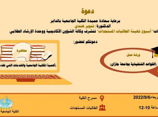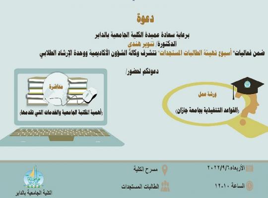 حرصا من سعادة عميدة الكلية الجامعية بالداير الدكتورة تنوير أحمد هندي علي حسن تهيئة الطالبات المستجدات للاندماج في الحياة الجامعية ، قدمت وكالة الشؤون الأكاديمية ممثلة في وحدة الإرشاد الطلابي برنامج تعريف الطالبة بالقواعد التنفيذية بجامعة جازان قدمته