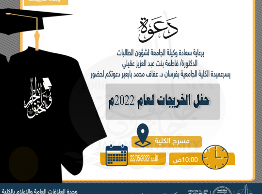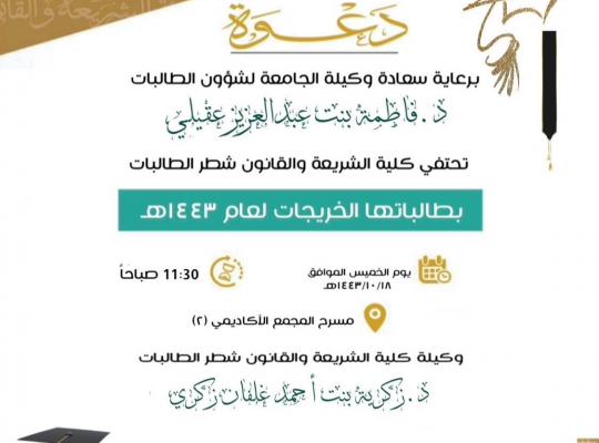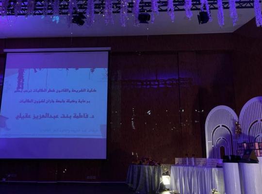جامعة جازان: إدارة الإعلام برعاية وكيلة جامعة جازان لشؤون الطالبات الدكتورة فاطمة بنت عبدالعزيز عقيلي نظمت كلية الشريعة والقانون شطر الطالبات حفل تخرج طالباتها للعام الجامعي ١٤٤٣هـ بحضور عدد من وكيلات ومنسوبات الجامعة. افتتحت فعاليات الحفل بكلمة