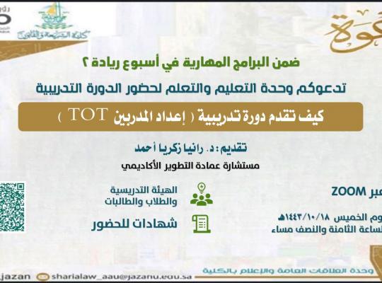 ضمن فعاليات ريادة٢ 🎙 حلقة نقاش "كيف تقدم دورة تدريبية - إعداد المدربين TOT" 👤قدمتها د. رانيا زكريا (مستشارة عمادة التطوير الأكاديمي) 🗓 يوم الخميس ١٨ شوال ١٤٤٣هـ 🕰 الساعة ٨.٣٠ مساء 📍عبر ZOOM https://zoom.us/j/94272061193?pwd