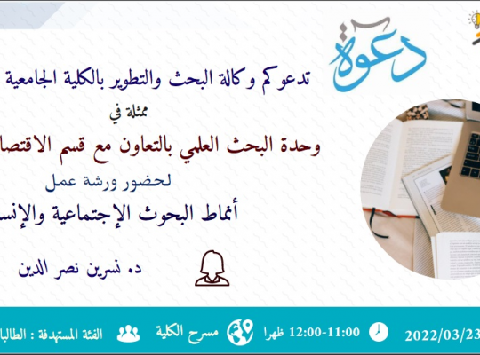 جامعة جازان: إدارة الإعلام نفذت وحدة البحث العلمي بالكلية الجامعية بمحافظة صامطة بالتعاون مع قسم الاقتصاد المنزلي ورشة عمل بعنوان (أنماط البحوث الاجتماعية والإنسانية). قدمتها الدكتورة نسرين نصر الله، واستهدفت فيها طالبات الكلية. تمثلت محاور الورشة في