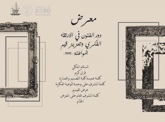 جامعة جازان: إدارة الإعلام أقامت كلية التصميم و العمارة برعاية عميدة الكلية الأستاذ الدكتور/فاطمة الشيخ معرضا افتراضيا بعنوان " دور الفنون في الارتقاء الفكري و تعزيز قيم المواطنة بالتعاون مع وحدة التوعية الفكرية بالجامعة. الدكتور سنوي شراحيلي المشرف