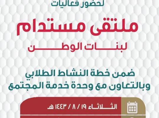 جامعة جازان: إدارة الإعلام برعاية وكيلة الجامعة لشؤون الطالبات الدكتورة فاطمة بنت عبدالعزيز عقيلي وبإشراف عميدة الكلية الجامعية بصبيا الدكتورة فاطمة محمد بريك نفذت الكلية الجامعية بصبيا ملتقى مستدام لبنات الوطن ضمن خطة النشاط الطلابي وبالتعاون مع