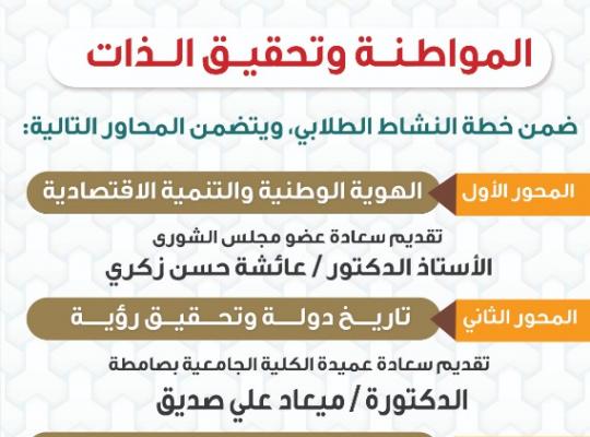 جامعة جازان: إدارة الإعلام برعاية وكيلة الجامعة لشؤون الطالبات الدكتورة فاطمة بنت عبدالعزيز عقيلي وبإشراف عميدة الكلية الجامعية بصبيا الدكتورة فاطمة محمد بريك نفذت الكلية الجامعية بصبيا بالتعاون مع الكلية الجامعية بفرسان برنامج المواطنة وتحقيق الذات