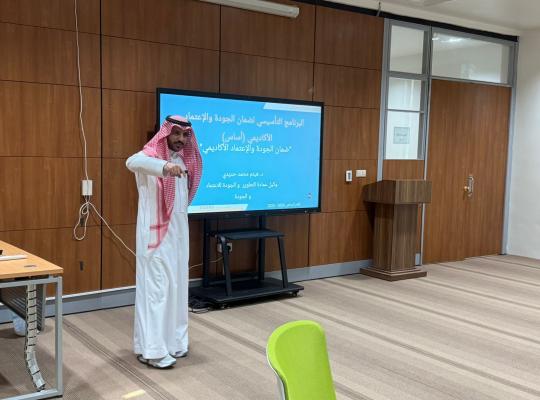 واصلت عمادة التطوير والجودة بالجامعة البرنامج التأسيسي لضمان الجودة والاعتماد الأكاديمي "أساس" في نسخته الثانية والذي يهدف إلى رفع مستوى وعي أعضاء هيئة التدريس ومنسقي البرامج بمعايير الجودة ومتطلبات الاعتماد وفق منهجية المركز الوطني للتقويم والاعتماد