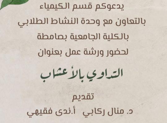 نظم قسم الكيمياء بالتعاون مع وحدة النشاط الطلابي بالكلية الجامعية بصامطة ورشة عمل بعنوان (التداوي بالأعشاب). نفذتها د.منال ركابي وأ.ندى فقيهي، واستهدفت طالبات قسم الكيمياء. في بداية الورشة تم استفتاء الحاضرات حول تأييدهم للعلاج بالاعشاب لمعرفة