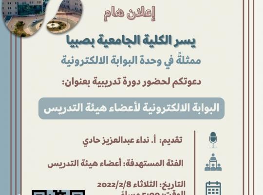 جامعة جازان: إدارة الإعلام نفذت الكلية الجامعية بصبيا ممثلةً بوحدة البوابة الالكترونية دورة تدريبية بعنوان ( البوابة الالكترونية لأعضاء هيئة التدريس ) استهدفت أعضاء هيئة التدريس، وقد شهدت إقبالًا كبير من الحضور. تناولت الدورة كيفية الاستفادة من جميع