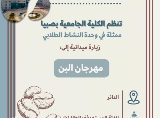 نفذت الكلية الجامعية بصبيا متمثلةً في وحدة النشاط الطلابي وباشراف العميدة د.فاطمة بريك زيارة ميدانية إلى مهرجان البن في محافظة الدائر شارك فيها عدد من منسوبات الكلية وطالباتها. ابتدأت الزیارة برقصة شعبیة من أحدى الفرق وتلتها نبذة تعريفية بين أروقة