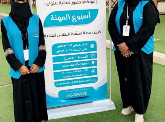 نفذت الكلية الجامعية بصبيا متمثلة بوحدة النشاط الطلابي بالتعاون مع بلدیة محافظة صبیا وباشراف العميدة د.فاطمة بريك فعالية اليوم العالمي للمهنة خلال الفترة من الخمیس ١٤٤٣/٠٦/٢٤ وحتى السبت ١٤٤٣/٠٦/٢٦ھـ بحديقة الملك فهد بصبیا. شارك في الفعالية الأقسام