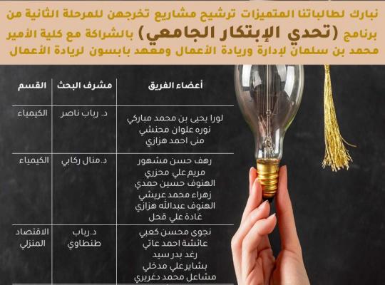 تتقدم الكلية الجامعية بصامطة بالتهنئة لطالباتها المتميزات ترشيح مشاريع تخرجهن للمرحلة الثانية من برنامج تحدي الابتكار الجامعي بالشراكة مع كلية الأمير محمد بن سلمان لإدارة وريادة الأعمال ومعهد بابسون لريادة الأعمال. و الشكر موصول لمشرفي الأبحاث. أصدق