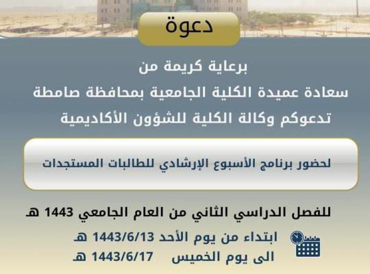 جامعة جازان: إدارة الإعلام نظمت الكلية الجامعية بصامطة برنامج الأسبوع الإرشادي لاستقبال وتوعية الطالبات المستجدات، والذي نفذته وحدة الإرشاد الأكاديمي بالكلية بالتعاون مع وحدة النشاط الطلابي برعاية عميدة الكلية الدكتورة/ ميعاد بنت علي صديق في مسرح