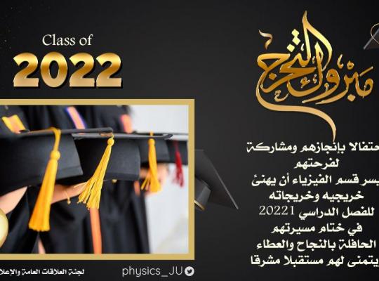 احتفالا بانجازهم ومشاركة في لفرحتهم يسر قسم الفيزياء تهني خريجيه و خريجاته للفصل الدراسي 20221 في ختام مسيرتهم الحافلة بالنجاح والعطاء و يتمني لهم مستقبلا مشرقا و يوجه لهم تللك الكلمات "في داخلكم قوى عظيمة تستطيع أن تقودكم إلى النجاح والتخرج إذا