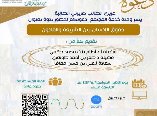 برعاية كريمة من عميد الكلية فضيلة الأستاذ الدكتور/ محمد بن ناصر جده نفذت وحدة خدمة المجتمع بكلية الشريعة والقانون، ندوة بعنوان (حقوق الإنسان بين الشريعة والقانون) ودور المملكة العربية السعودية فيها افتتحت الندوة بكلمة من عميد الكلية ورحب من خلالها