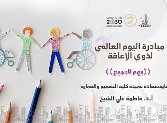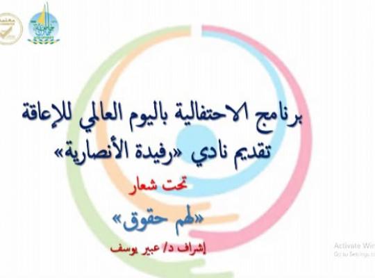 برعاية سعادة عميدة الكلية الدكتورة / تنوير احمد هندي قدمت فتيات نادي رفيدة الانصارية برنامج الخدمة المجتمعية للاحتفال باليوم العالمي للاعاقة تحت شعار "لهم حقوق"، انطلقت الفعاليات في تمام الثامنة مساءً بكلمة افتتاحية لسعادة عميدة الكلية تلاها عرض