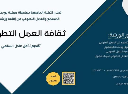 جامعة جازان: إدارة الإعلام نفذت الكلية الجامعية بصامطة ممثلة في وحدة خدمة المجتمع والتعليم المستمر ورشة عمل بعنوان (ثقافة العمل التطوعي). قدمتها أ. أمل السلمي، حيث تطرقت الورشة لدور التطوع في تنمية المجتمعات، إضافة إلى أهمية العمل التطوعي لدى الأفراد