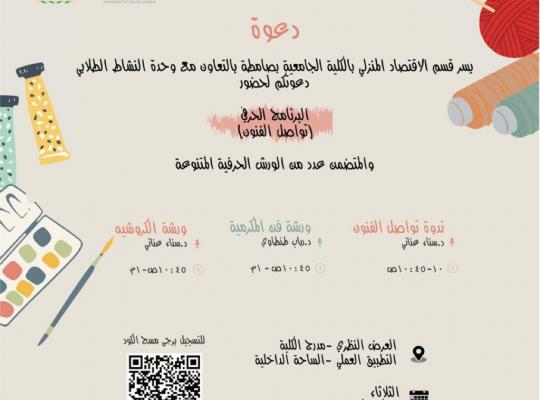 جامعة جازان: إدارة الإعلام نظمت الكلية الجامعة بصامطة ممثلةً في قسم الاقتصاد المنزلي بالتعاون مع وحدة النشاط الطلابي بالكلية البرنامج الحرفي (تواصل الفنون ). بدأ البرنامج بندوة (تواصل الفنون) نفذتها د. سناء عناني، وتحدثت فيها عن ماهية الفن وأهميته؛