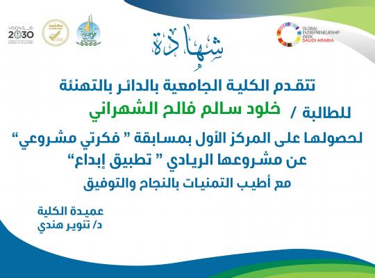 جامعة جازان: إدارة الإعلام برعاية عميدة الكلية الدكتورة / تنوير هندي قدمت وحدة الابتكار وريادة الأعمال بالكلية الجامعية بالداير حفل ختامي لتكريم الفائزات بمسابقة " فكرتي مشرعي" ، ضمن فعاليات برنامج الاحتفال بالأسبوع العالمي لريادة الأعمال والذي تضمن