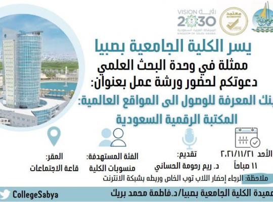 جامعة جازان: إدارة الإعلام نظمت الكلية الجامعية بصبيا ممثلةً بوحدة البحث العلمي بالتعاون مع قسم التمريض ورشة عمل بعنوان ” بنك المعرفة للوصول إلى المواقع العالمية " المكتبة الرقمية السعودية” قدمتها الدكتورة ريم رحومة الحساني في الكلية الجامعية بصبيا