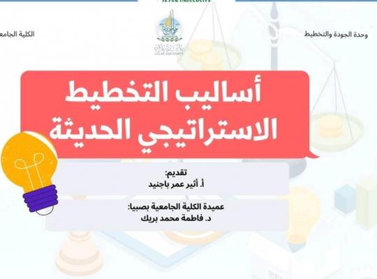 نظمت الكلية الجامعية بصبيا متمثلةً بوحدة الجودة والتخطيط الاستراتيجي دورة تعريفية بعنوان” أساليب التخطيط الاستراتيجي الحديثة" وذلك يوم الثلاثاء الموافق ٢٣/١١/٢٠٢١. قدمتها أ. أثير باجنيد من قسم الحاسب. تم تنفيذ الدورة عبر تطبيق الزوم مستهدفة أعضاء